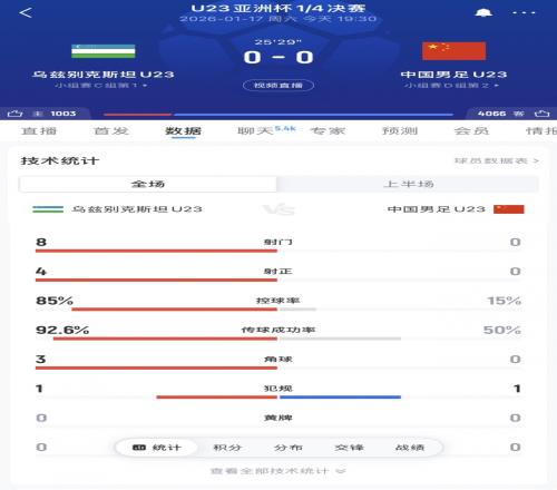 比赛进行到第26分钟,国足U23场面上非常被动,被乌兹别克斯坦U23压制,控球率仅15%,对手8次射门,4脚射正。