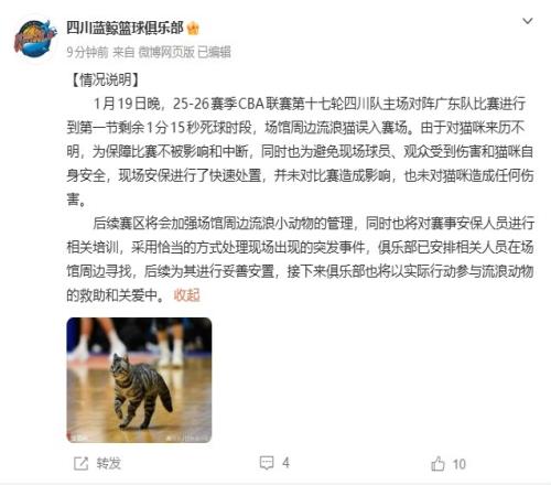 1月19日晚,25-26赛季CBA联赛第十七轮四川队主场对阵广东队比赛进行到第一节剩余1分15秒死球时段,场馆周边流浪猫误入赛场。由于对猫咪来历不明,为保障比赛不被影响和中断,同时也为避免现场球员、观众受到伤害和猫咪自身安全,现场安保进行了快速处置,并未对比赛造成影响,也未对猫咪造成任何伤害。